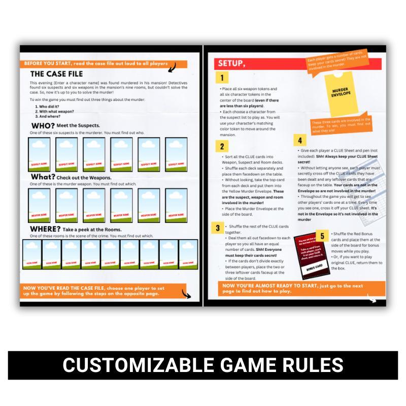 " I was so excited to find this editable Clue game! I have been looking for something like this for the last two years, soon after my son was old enough to play and master it! I’ve purchased other editable Clue games so we can create one of our own and each one has proven to be disappointing in some way, from parts of the game not being editable to games that just don’t have the same flair of looking like the real game. As soon as I purchased this editable Clue game, we went right to work, and we are already finished making our first of what I’m sure will be many of our very own Clue game, customized easily and without a single hitch in a matter of a few hours, which was only that long because we were excitedly making up Clue suspects and backstories for them. This is the easiest and best template we’ve found, PERFECT! Thanks! "